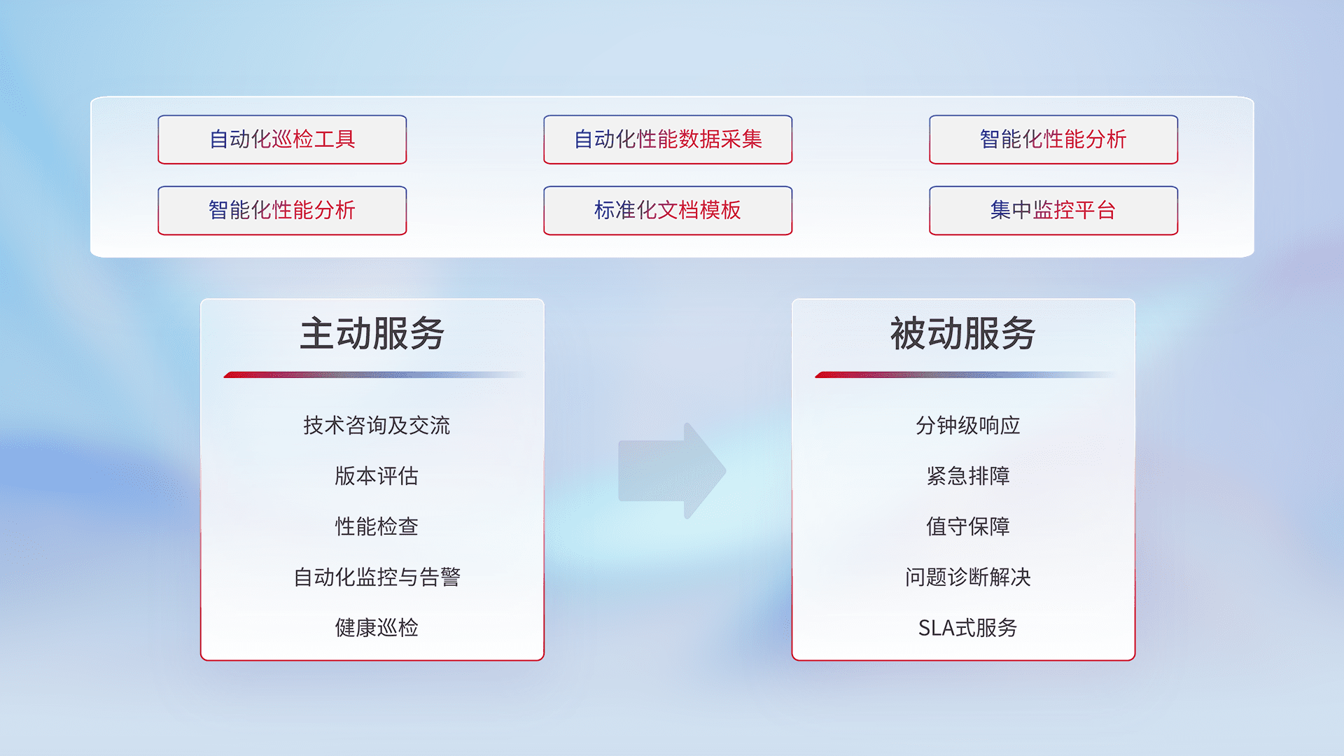 智能化工具和标准化文档,,,,保障服务质量,,提供主动服务(包含技术咨询、、版本评估、、性能检查、、、自动化监控与告警、、、健康巡检)和被动服务包含(分钟级响应、、、紧急排障、、值守保障、、问题诊断解决、、、、SLA服务)。。。